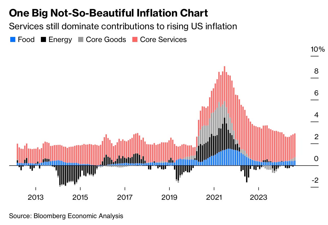 What stands out today is what remains. Energy and goods inflation have eased, even turning negative at points, yet inflation has not gone away. The red bars, which represent core services, dominate the picture. Housing, healthcare, insurance and other service costs are proving sticky. This is why the Fed is uneasy. Even if supply chains heal and oil prices stabilise, services inflation is hard to shift quickly.